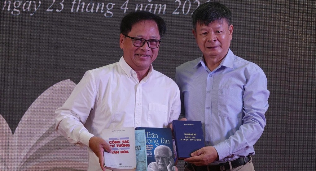 Ông Trần Trọng Ninh (phải) - con trai ông Trần Trọng Tân, cựu tù chính trị Côn Đảo - trao tặng sách lịch sử cho đại diện ban tổ chức chương trình - ông Lê Hoàng, Giám đốc Đường sách TP HCM. Ảnh: Ban tổ chức cung cấp