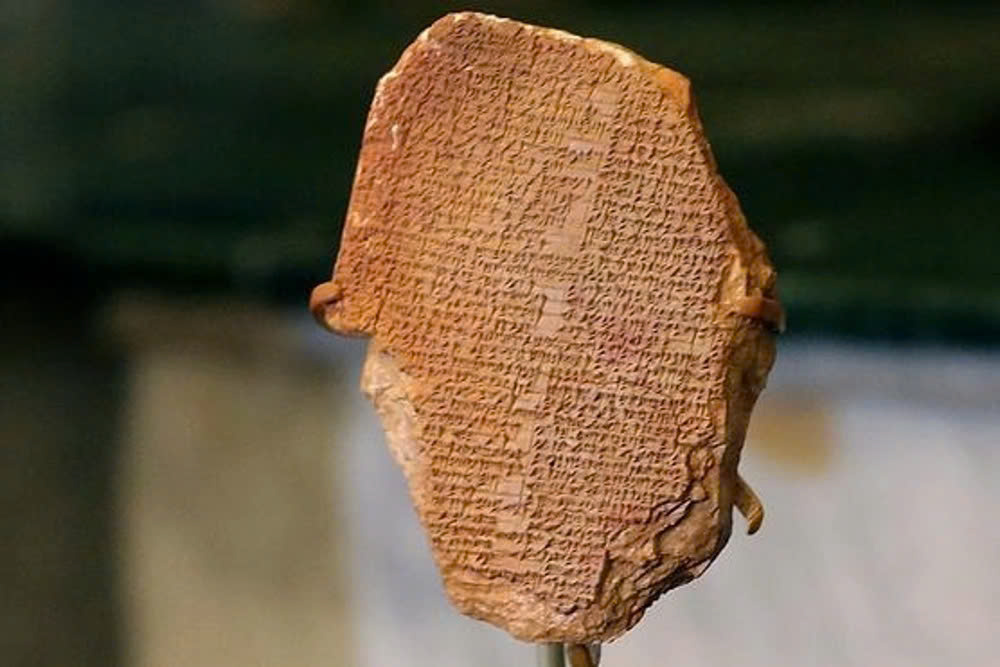 Tấm bia khắc một phần "Sử thi Gilgamesh" có xuất xứ tại vùng đất Lưỡng Hà (Iraq ngày nay) được trưng bày tại Bộ Ngoại giao Iraq ở Baghdad tháng 12/2021. Ảnh: AFP