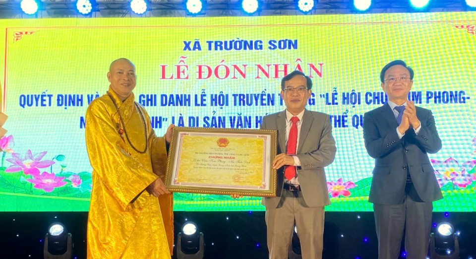 Tại buổi lễ, ông Hoàng Xuân Tân, Phó chủ tịch UBND tỉnh Quảng Trị, thừa ủy quyền của Bộ trưởng Bộ VH-TT-DL trao chứng nhận Lễ hội chùa Kim Phong - núi Thần Đinh (thuộc xã Trường Xuân, H.Quảng Ninh, Quảng Bình cũ, nay là xã Trường Sơn, tỉnh Quảng Trị) là di sản văn hóa phi vật thể quốc gia.