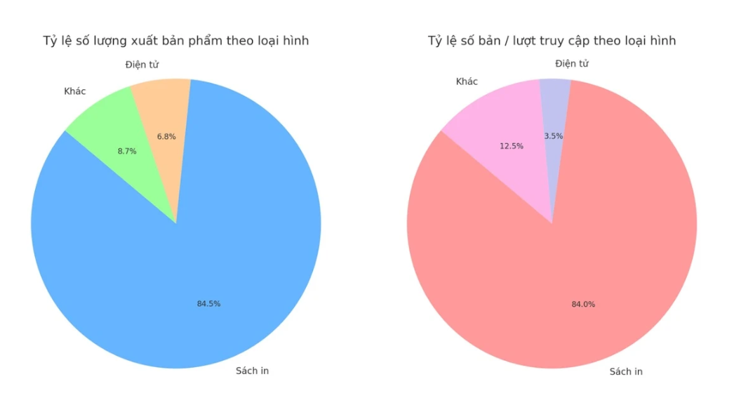 Biểu đồ tỷ trọng số lượng xuất bản phẩm và số bản / lượt truy cập theo loại hình.
