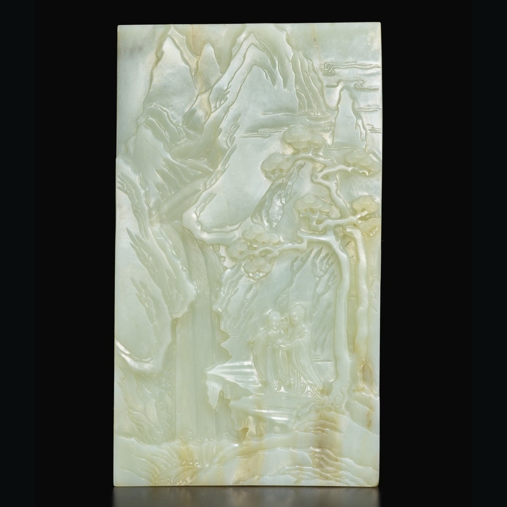 Hình người, thác nước chạm trổ trên ngọc. Ảnh: HK01