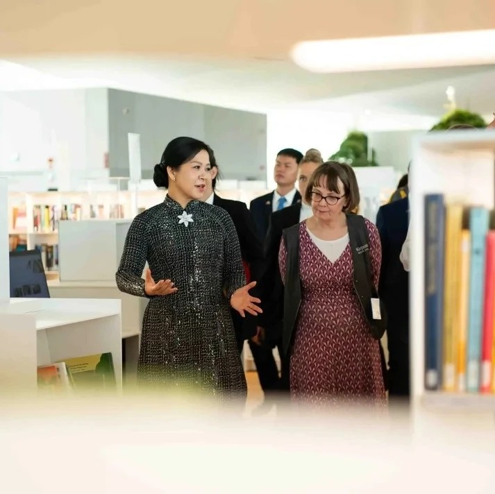Phu nhân Tổng Bí thư, Chủ tịch nước, bà Ngô Phương Ly, thăm và trao tặng Thư viện Oodi, Phần Lan "Tủ sách tiếng Việt" hôm 21/10/2025. Ảnh: Cổng thông tin điện tử Đảng Cộng sản Việt Nam. |